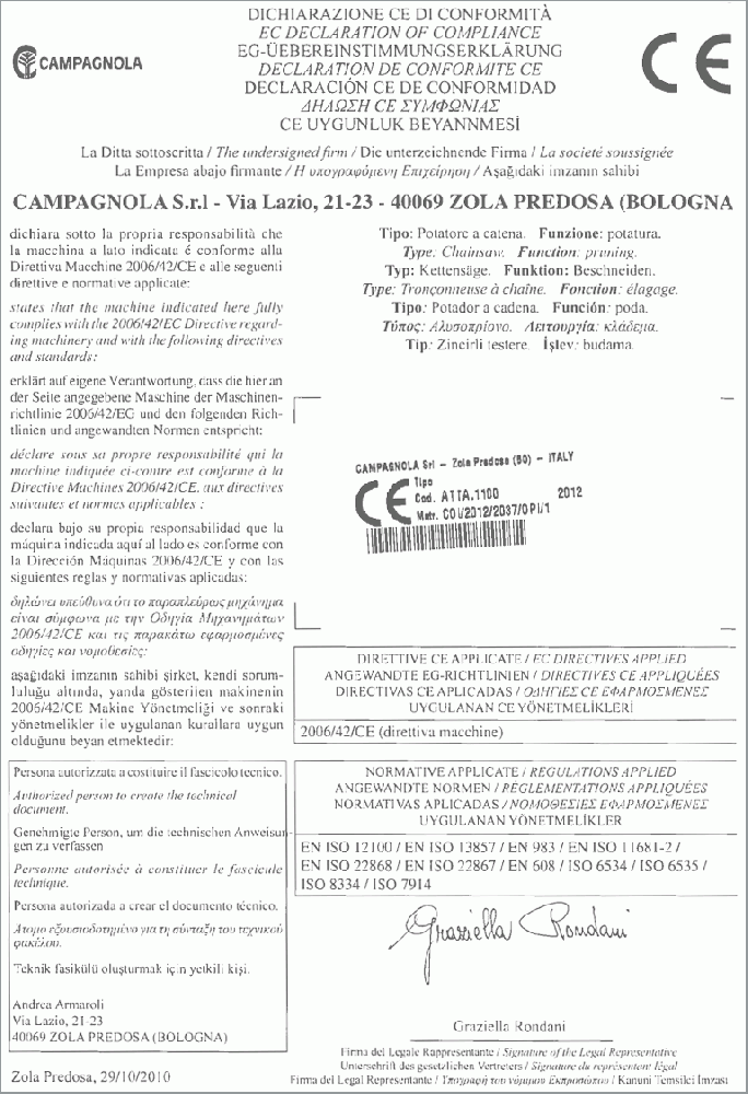 Στο εγχειρίδιο λειτουργίας θα βρείτε επίσης το πιστοποιητικό ποιότητας όπως αυτό εμφανίζεται παρακάτω. Το πιστοποιητικό αυτό σας εξασφαλίζει ότι το εργαλείο που προμηθευτήκατε έχει κατασκευαστεί βάση των προδιαγραφών της Ευρωπαϊκής Ένωσης και είναι κατάλληλο για την χρήση που προορίζεται και κυρίως ασφαλές για τον χειριστή. Τέτοιο τύπου πιστοποιητικό θα σας είναι απαραίτητο εάν αποφασίσετε να εντάξετε την αγορά σας σε κάποιο πρόγραμμα επιδότησης της Ελλάδας ή της Ευρωπαϊκής Ένωσης. Μην προμηθεύεστε προϊόντα που δεν συμμορφώνονται στις οδηγίες της Ευρωπαϊκής Ένωσης καθώς πρώτα από όλα θέτετε σε κίνδυνο τον εαυτό σας.
