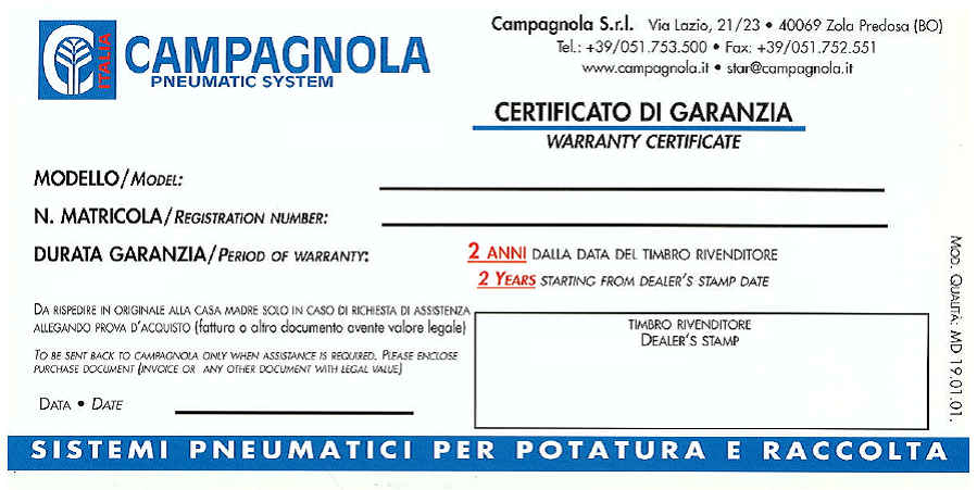 Όλα τα εργαλεία Campagnola καλύπτονται με 2 (δύο) χρόνια εργοστασιακή εγγύηση καλής λειτουργίας βάση των προδιαγραφών χρήσης και λειτουργίας που αναφέρονται στο εγχειρίδιο λειτουργίας, εφόσον έχουν τηρηθεί οι όροι λειτουργίας, το εργαλείο έχει διανεμηθεί από το συνεργαζόμενο δίκτυο της και η κάρτα εγγύησης είναι σφραγισμένη και συνοδεύεται απο απόδειξη ή τιμολόγιο πώλησης που πιστοποιεί την ημερομηνία αγοράς.